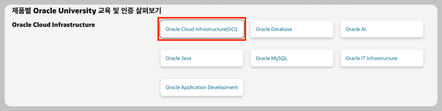 3. 스크롤 내리다 보면 제품별 Oracle University 교육 및 인증 살펴보기의 Oracle Cloud Infrastructure(OCI) 클릭