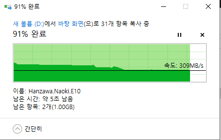또 , 이놈은 외장하드 -> 데스크탑 속도입니다. 처음에는 410정도 나오더니 300까지 떨어졌네요…