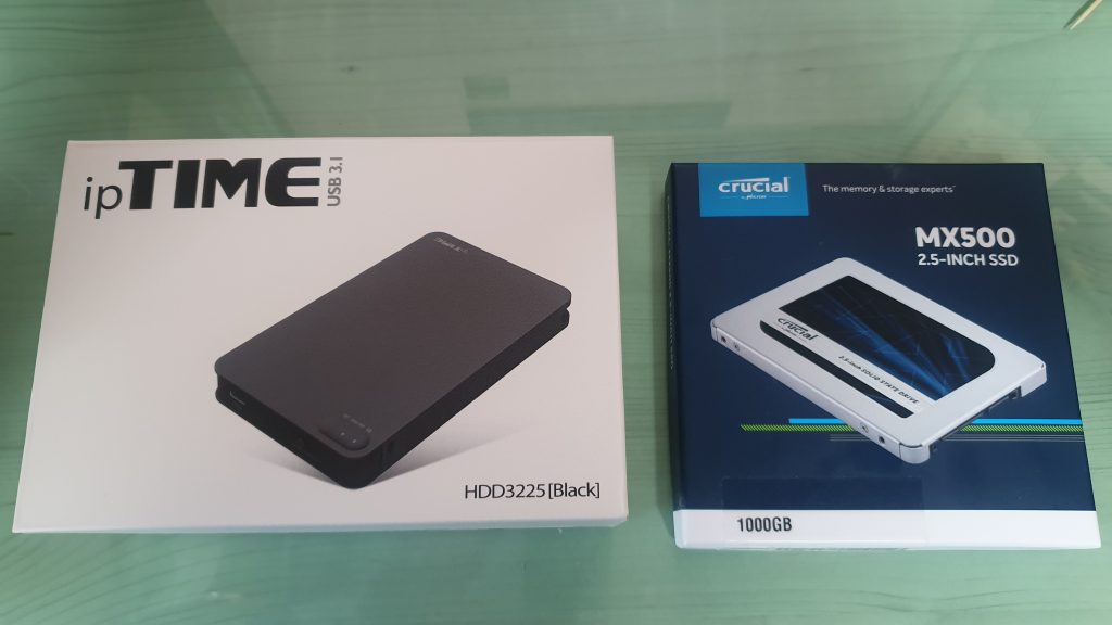 왼쪽이 HDD3225 외장하드 케이스, 오른쪽이 MX500 1TB 제품입니다. 케이스 같은 경우는 국내에서 최저가로 구매했고, ssd는 해외 사이트에서 11만 5천원 정도에 구입했습니다.