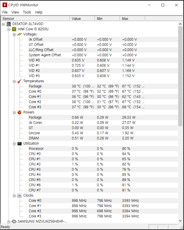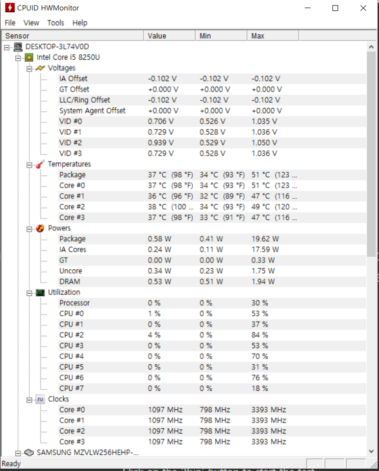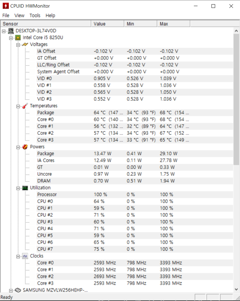 암튼, 이렇게 마무리를 하고 조립하여 온도를 체크해 보았습니다. 참고로언더볼팅도 같이 해주었습니다. (-0.100v)