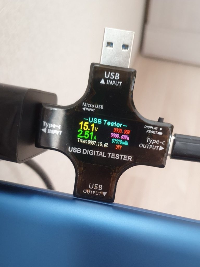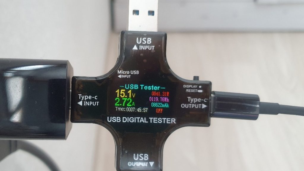 41.31w 정도 나왔고, 그 뒤로도 42w 정도까지 올라갔습니다. 하지만 45w로는 충전이 되지 않았습니다. 또, 3칸 이후부터는 10w로 뚝 떨어져 충전이 되어, 3칸 ~ 풀충전까지는 시간이 좀 걸린 것 같았습니다. 45w로 충전시에는 3시간 정도 걸린다고 하는데, 실제 방전상태에서 풀충전까지 해본다면 45w를 계속 뽑아내지 못하기 때문에 4~5시간은 걸리겠네요!