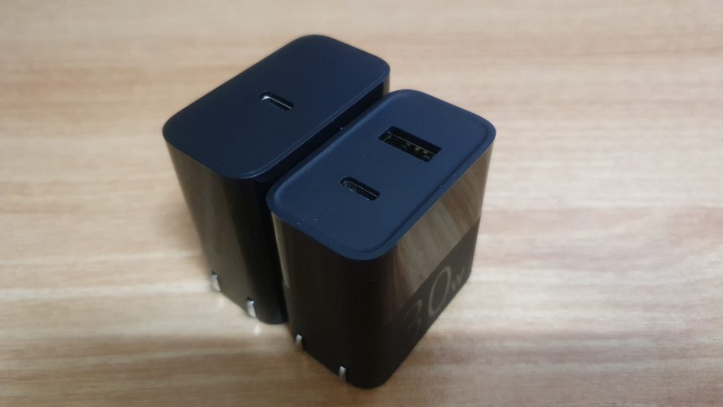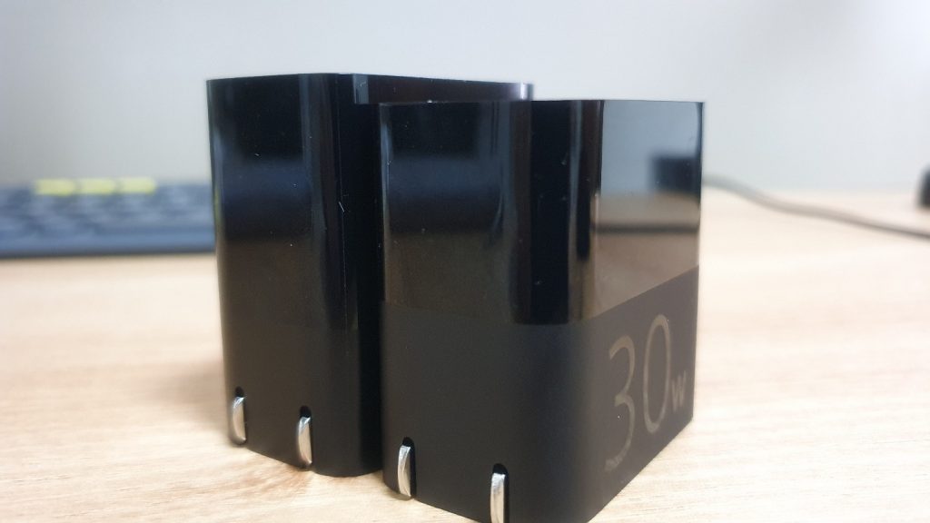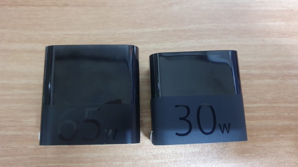 왼쪽이 65W 충전기 오른쪽이 30W 충전기 입니다. 보시다 시피 크기 차이는 거의 없고 무게 차이가 생각보다 있습니다. 65W 충전기의 무게는 96g이라 약 30g이 차이 나는데 이게 체감상으로는 좀 크게 느꼈습니다.