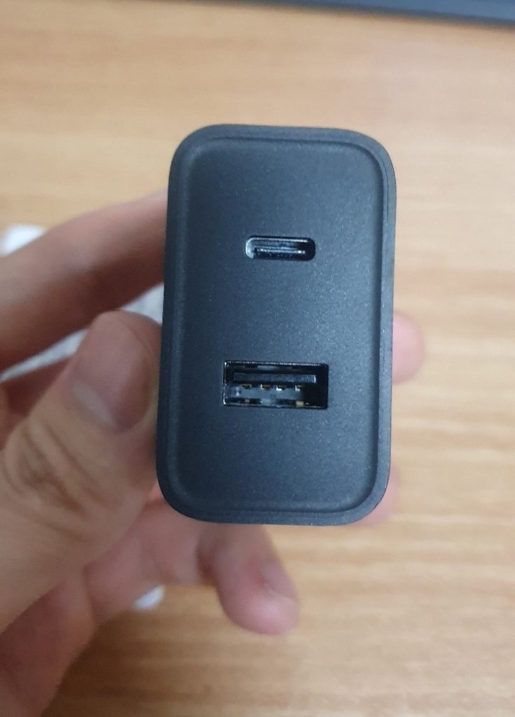 한손에 꼭 들어오는 사이즈입니다. 포트면에는 종이 커버가 붙어있었는데 떼어내면 위와 같이 두개의 포트가 있습니다.